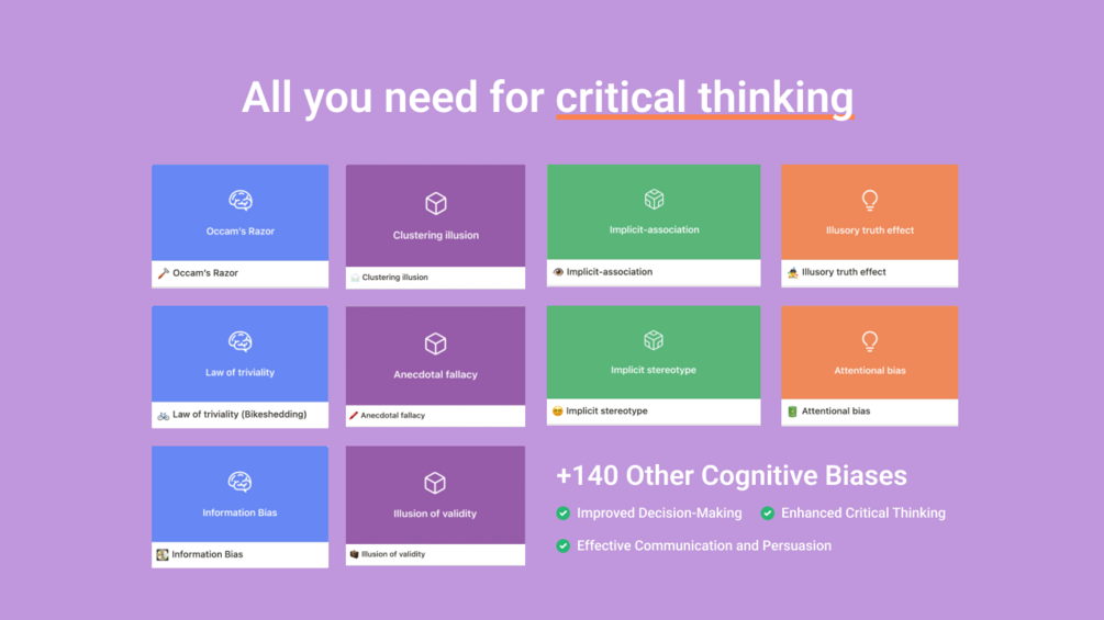 Bias Notion —Cognitive Biases Template contains 150+ cognitive biases and fallacies, 20+ books and podcasts about cognitive psychology.